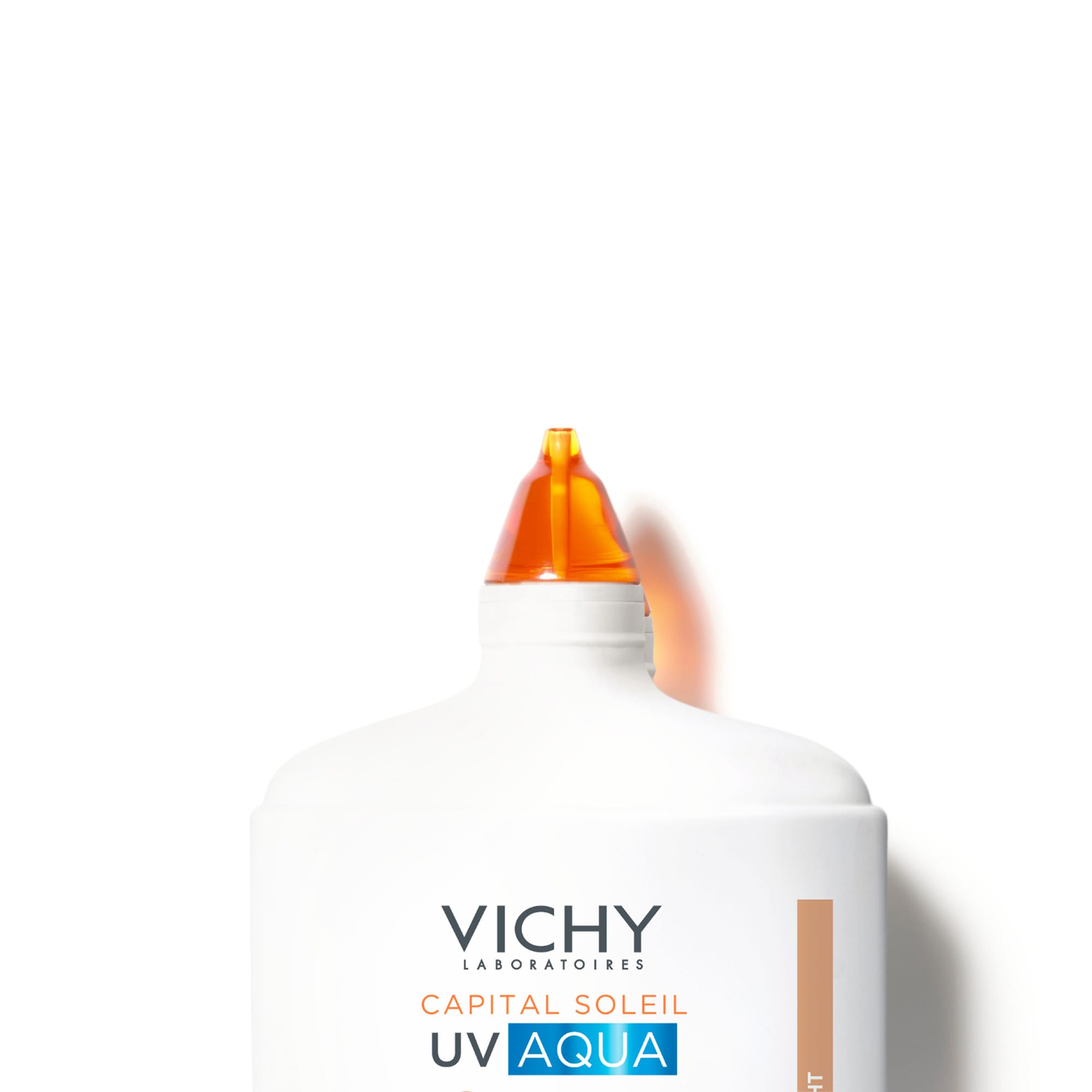 Vichy Capital Soleil UV-Aqua Hydrating Fluid Tinted SPF 50 er létt, lituð og rakagefandi sólarvörn fyrir andlit og augnsvæði.
