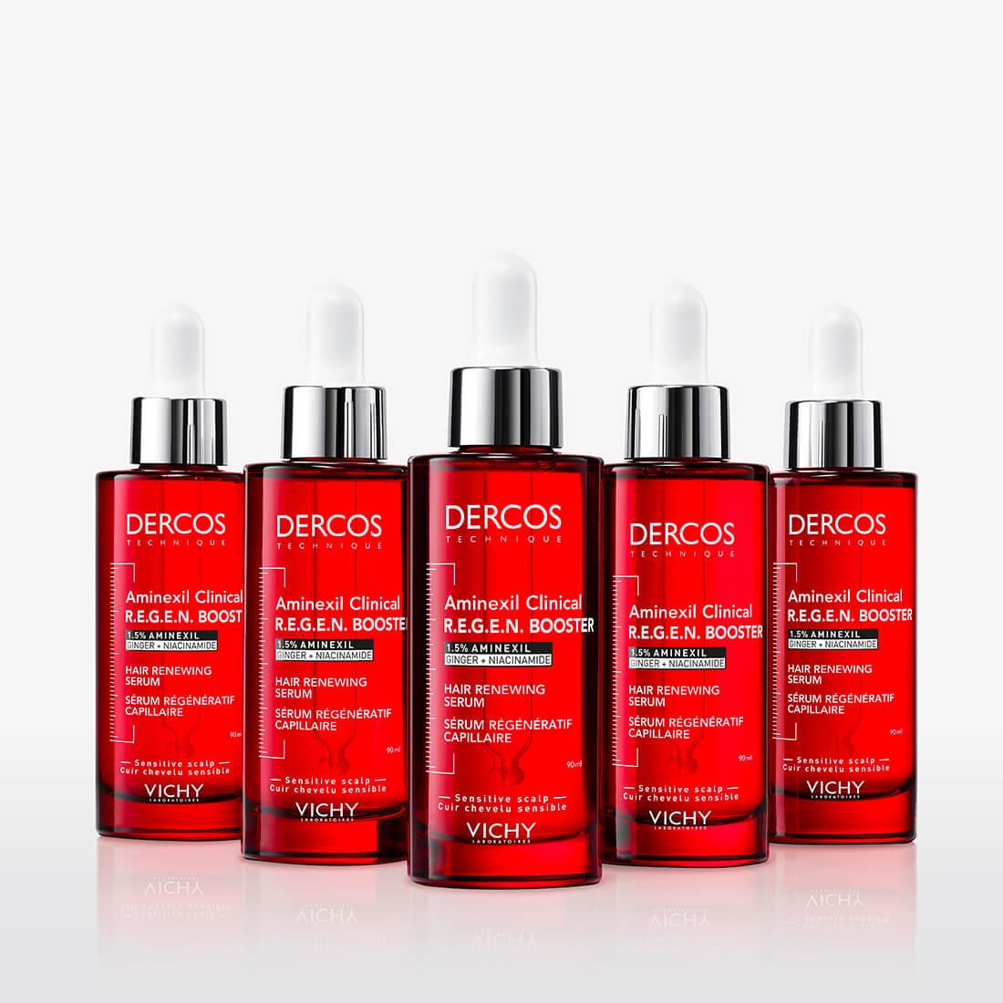 DERCOS Aminexil R.E.G.E.N. Booster er styrkjandi serum sem hjálpar til við að draga úr tímabundnu hárlosi með því að styrkja hárið og minnka hættuna á að hárið brotni.