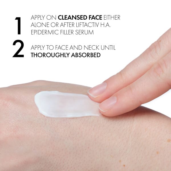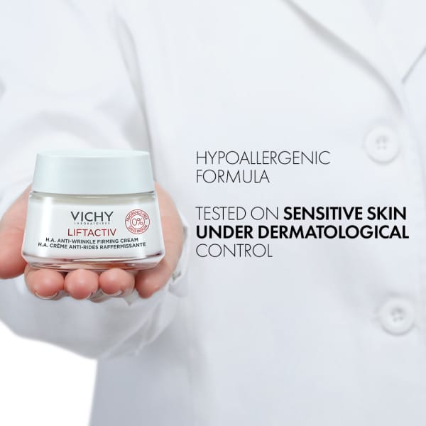 Vichy Liftactiv H.A. er öflugt dagkrem sem dregur úr hrukkum og fínum línum auk þess að gefa húðinni ljóma. Húðin verður mýkri og stinnari. Kremið inniheldur hýalúrónsýru sem veitir djúpan raka og gerir hrukkur og fínar línur minna sýnilegar. Auk þess inniheldur kremið C vítamín sem veitir húðinni ljóma og brot af góðgerli (e. probiotic) af náttúrulegum uppruna sem vernda húðina fyrir utanaðkomandi áreiti. Sýnilegur árangur eftir 4 vikur. Hentar öllum húðgerðum. Þróað, prófað og mælt með af húðsjúkdómalæknum um allan heim.