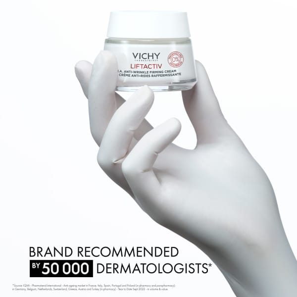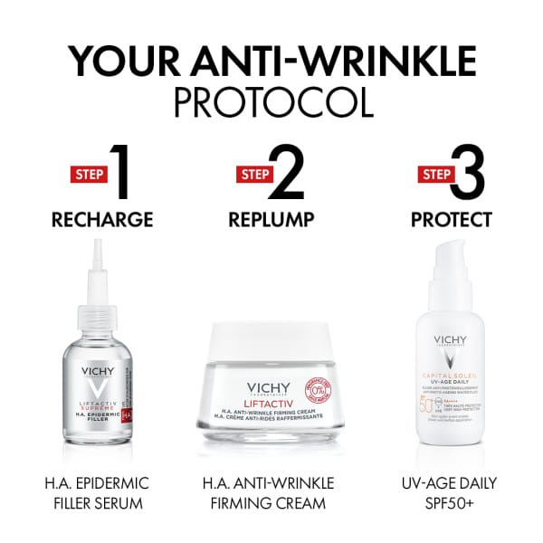 Vichy Liftactiv H.A. er öflugt dagkrem sem dregur úr hrukkum og fínum línum auk þess að gefa húðinni ljóma. Húðin verður mýkri og stinnari. Kremið inniheldur hýalúrónsýru sem veitir djúpan raka, C vítamín sem veitir húðinni ljóma og brot af góðgerli sem verndar húðina. Þróað, prófað og mælt með af húðsjúkdómalæknum um allan heim.