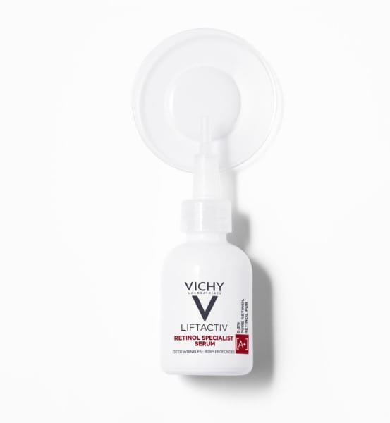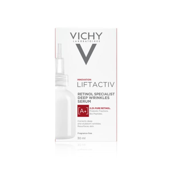 Vichy Liftactiv Specialist Retinol Serum er kröftugt næturserum sem inniheldur 0,2% hreint retinól sem örvar endurnýjun frumna og vinnur á grunnum og djúpum hrukkum. Inniheldur einnig brot af góðgerlum (e. probiotics) sem er þekktur fyrir húðviðgerðareiginleika sína og styrkir ysta lag húðarinnar. Serumið þéttir og sléttir á meðan það dregur úr dökkum blettum og bætir ljóma. Húðin verður mýkri, áferðafallegri og fær aukinn ljóma. Hentar öllum húðgerðum. Þróað, prófað og mælt með af húðsjúkdómalæknum um allan heim.