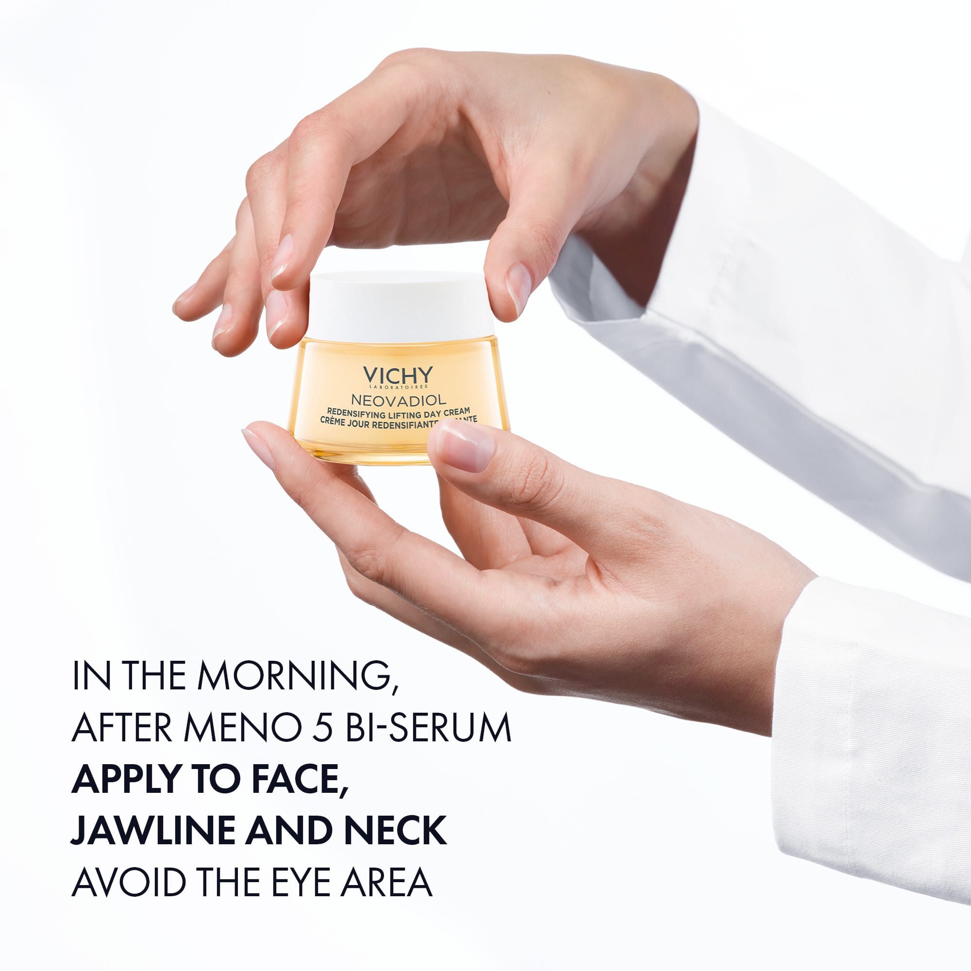 Dagkrem fyrir þurra húð sem er þróað fyrir húð kvenna sem eru á breytingarskeiði. Miklar breytingar eiga sér stað í húðinni á þessum tímabili þar sem breytingar eru á oestragen gildum húðarinnar og um leið minnkar collagen framleiðsla húðarinnar töluvert. Hún verður þur, þröng og pirruð og teygjanleiki minnkar töluvert ásamt fyllingu húðarinnar sem gerir það að verkum að hún verður slöpp og línur og hrukkur aukast. Með hjálp Peri-Menopause dagkremsins verður húðin rólegri og hún fær talsvert meiri raka og næringu. Kremið er ríkt af Proxylane, cassia fræum og hayluronic acid sem skerpa á andlitsdráttum húðarinnar, næra hana, færa henni ljóma og almenna vellíðan með kælandi eiginleikum. VICHY hefur helgað sig að rannsóknum á áhrifum breytingarskeiðs á húðina í yfir 20 ár.