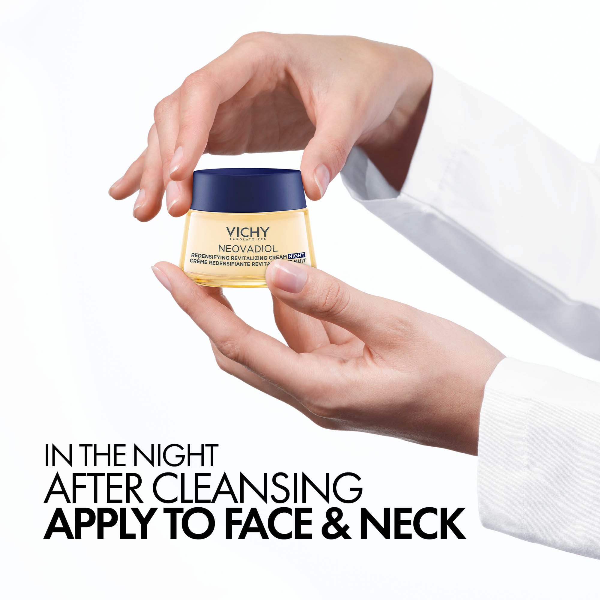 Berið kremið á hreina húð á kvöldin bæði andlit og háls, forðist að fara of nálægt augnsvæðinu. Notið styrkjandi serum undir kremið til að fá meiri virkni.