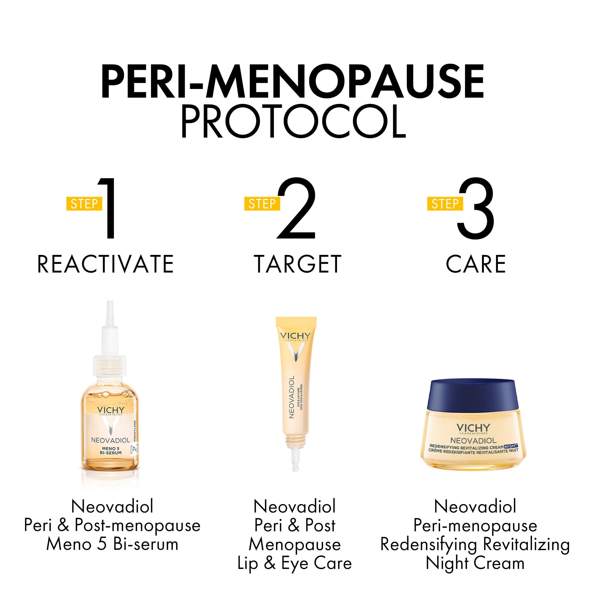 Næturkrem sem er þróað fyrir húð kvenna sem eru á breytingarskeiði. Húðin gengur í gegnum miklar breytingar á breytingarskeiði en hún missir mikinn raka, collagen framleiðsla húðarinnar minnkar og húðin verður þur, óþægileg og þröng. Peri Menopause kremið er létt og gelkennt, það róar húðina og veitir henni aukinn raka og kælir húðina á næturnar sem eykur vellíðan í húðinni á nóttunni. Formúlan inniheldur, Proxylane, Hyalurnic Acid og steinefnaríka vatnið frá VICHY. VICHY hefur helgað sig að rannsóknum á áhrifum breytingarskeiðs á húðina í yfir 20 ár.