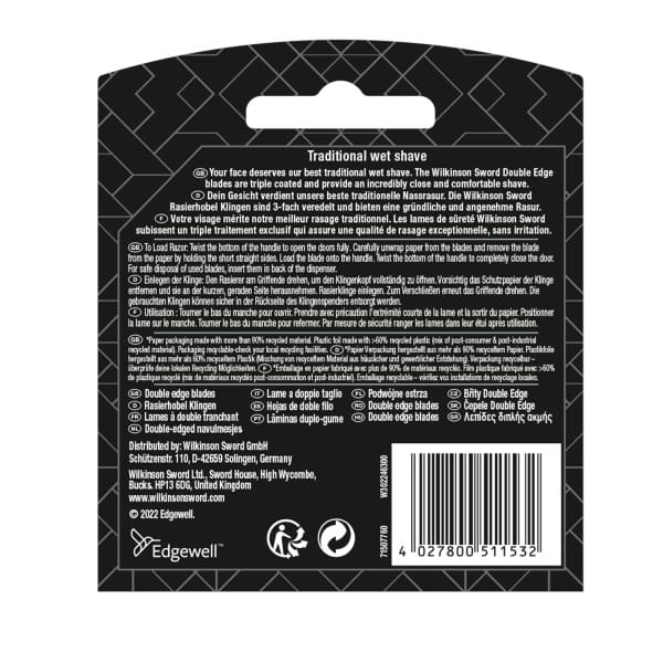 Andlitið þitt á skilið okkar besta hefðbundna blautrakstur. Wilkinson Sword Barber’s Style tvíeggja blöðin eru hönnuð til að veita ótrúlega nákvæman og þægilegan rakstur – á þann hátt sem aðeins klassískur, hefðbundinn blautrakstur getur. Tvíeggja blöðin eru þrefalt húðuð fyrir aukinn styrk og endingu. Það er í raun ekkert sem jafnast á við hefðbundinn blautrakstur – og með Wilkinson Sword The Edger geturðu notið rakarastofu tilfinningarinnar heima hjá þér!