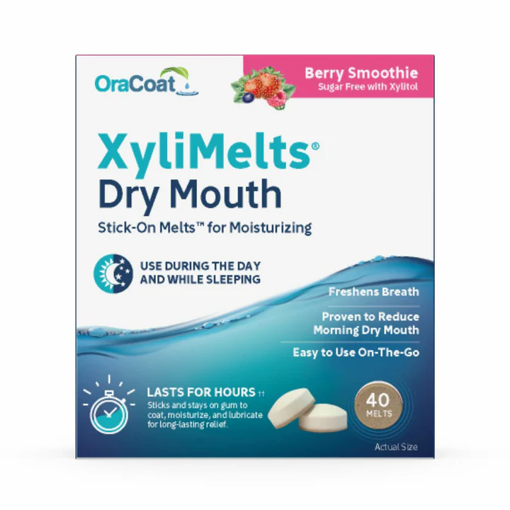 Viltu losna við munnþurrk allan sólarhringinn? XyliMelts eru litlar töflur sem loða við tennur, góm eða kinn og gefa frá sér xylitol (náttúrulega sykru) sem örvar munnvatnsflæði, kalsíum sem endurkalkar tennur og bíkarbónat sem hlutleysir sýrur í munninum.