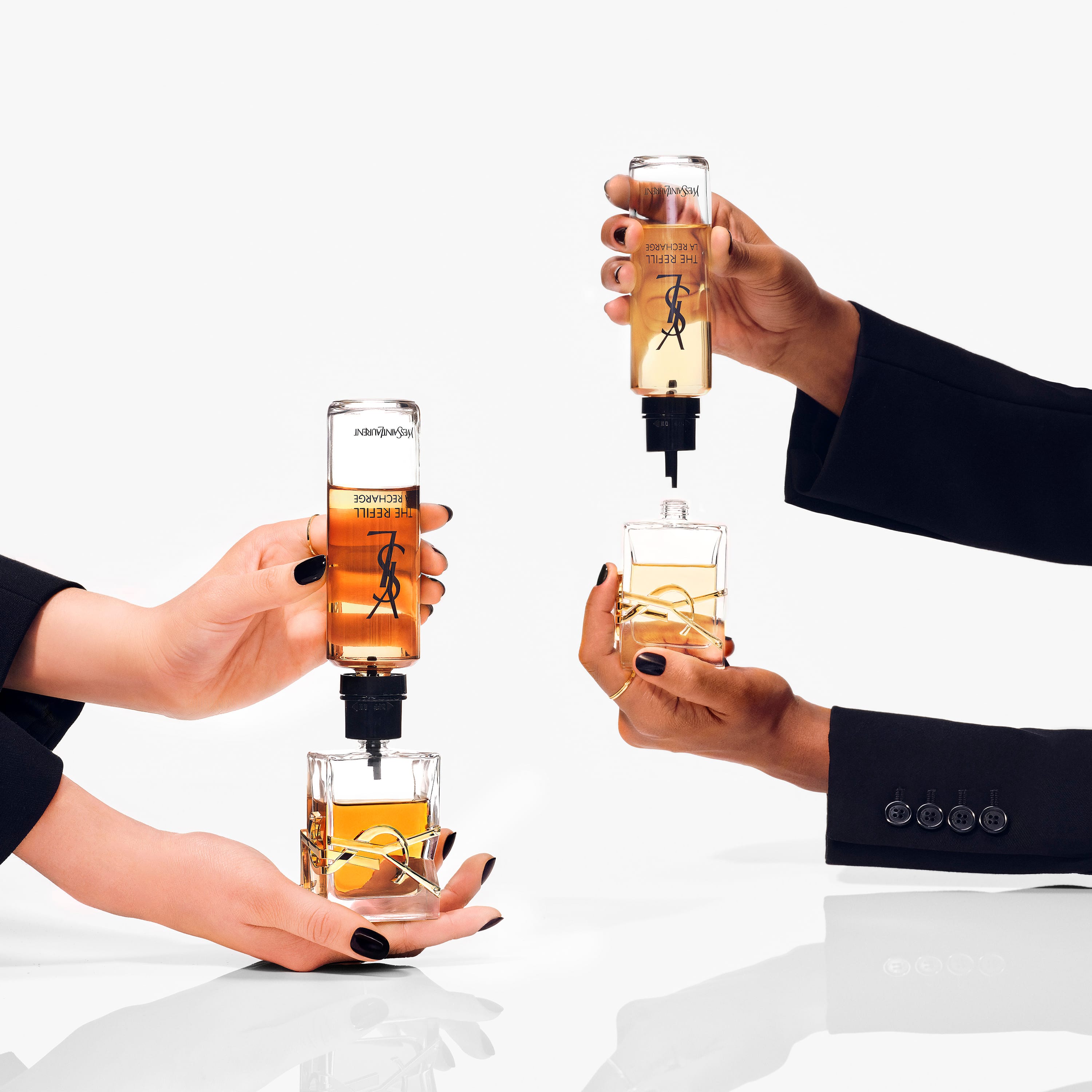 Fylltu á LIBRE Eau de Parfum Intense ilminn þinn frá Yves Saint Laurent, sem kemur nú í 100 ml áfyllingarflösku og er hönnuð til að minnka sóun á sama tíma og hún varðveitir ilminn sem þú elskar. Ilmurinn er hannaður fyrir hina hugrökku, frjálslyndu konu sem er samsettur blómailmur frönsku lavendilinsins, geislandi sætu marokkósku appelsínublómsins og æsandi djúpu bourbon vanillu. Niðurstaðan er ósvikinn og girnilegur ilmur. Áfylling ilmsins er mjög einföld: opnaðu pumparann, skrúfaðu áfyllingarflöskuna á og snúðu pumpunni í „ON“ stöðu til að losa ilminn. Þegar flaskan er full, snúðu pumpunni í „OFF“ og fjarlægðu pumparann. Ekkert ætti að fara út fyrir flöskuna og því engin sóun á ilminum. Þetta áfyllingarkerfi passar við allar áfyllanlegar flöskur af LIBRE Eau de Parfum Intense í stærðum 10 ml, 30 ml, 50 ml og 90 ml. Með þessari sjálfbæru aðgerð sparar þú allt að 58% gler, 59% plast og 100% málm miðað við óáfyllanlega gerðir. Láttu ilminn þinn endast lengur á sama tíma og þú minnkar umhverfisfótspor þitt. Upplifðu kraftinn í frelsinu í hverri dropa, ósvikinn, máttugt og óendanlega áfyllanlegt.